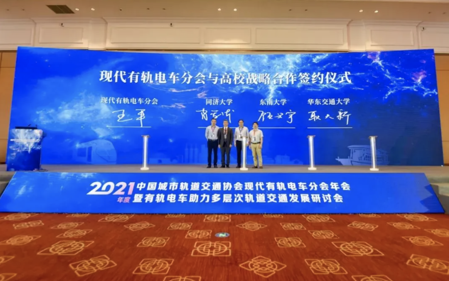 中国城市轨道交通协会现代有轨电车分会秘书长韩建良介绍会议情况及到访嘉宾,并作分会2020年年度工作报告及2021年计划;中国城市轨道交通协会现代有轨电车分会会长王平、中国城市轨道交通协会副秘书长王雁平、嘉兴市委常委、常务副市长陈利众分别致辞。现代有轨电车分会王平会长代表分会与同济大学、东南大学、华东交通大学等高校代表签订战略合作协议。
