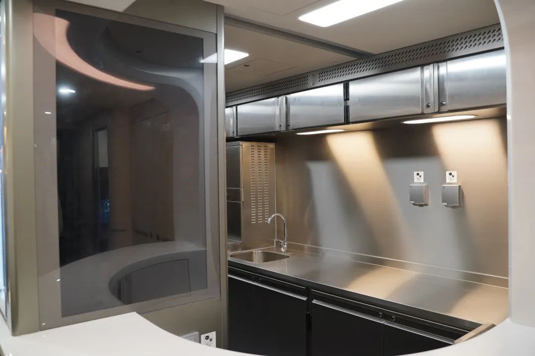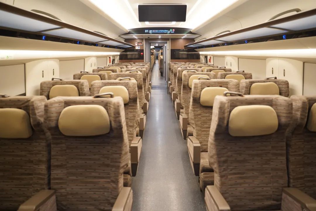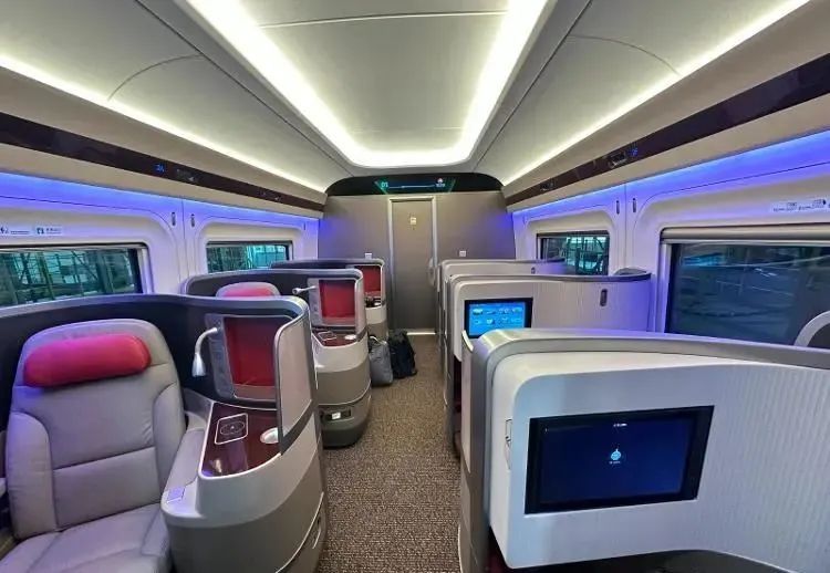 服务设施舒适便捷。车厢座椅均基于人因工程学进行优化,让旅客乘坐更加舒适、体验更美好。二等座椅靠背上增加方便旅客使用的USB充电接口,加深小桌板杯托凹槽深度,提高水杯放置的稳定性。一等座椅增加电动腿靠、可调节头靠,座椅间设置双USB口插座,方便旅客取用。商务仓采用“鱼骨式”布局设计,一人一舱,保证乘坐私密性,座椅增加无线充电、手机投屏、在线观影等功能,满足商务旅客需求。4号车厢为无障碍车厢,配备更宽的通过门、无障碍卫生间、轮椅及大件行李放置区等,所有服务设施均增加盲文标识,更好地满足特殊旅客的出行需求。