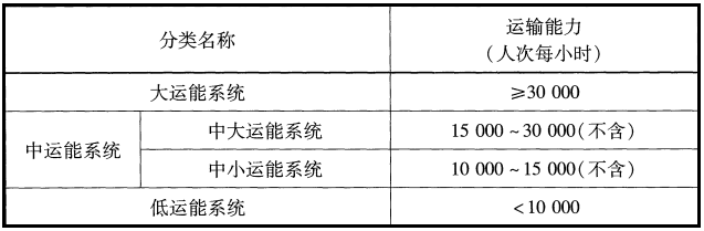 城市轨道交通按照运输能力划分为大运能系统、中运能系统和低运能系统三类,其中,中运能系统细分为中大运能系统和中小运能系统。各分类的运输能力指标见下表: