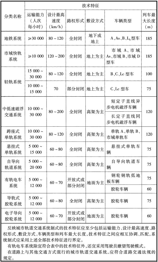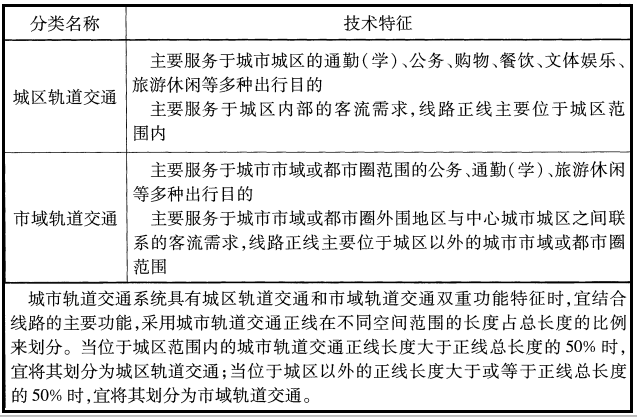 城市轨道交通按照空间范围划分为城区轨道交通和市域轨道交通两类。各分类的技术特征见下表: