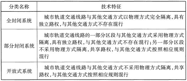 城市轨道交通按照路权形式划分为全封闭系统、部分封闭系统和开放式系统三类。各分类的技术特征见下表: